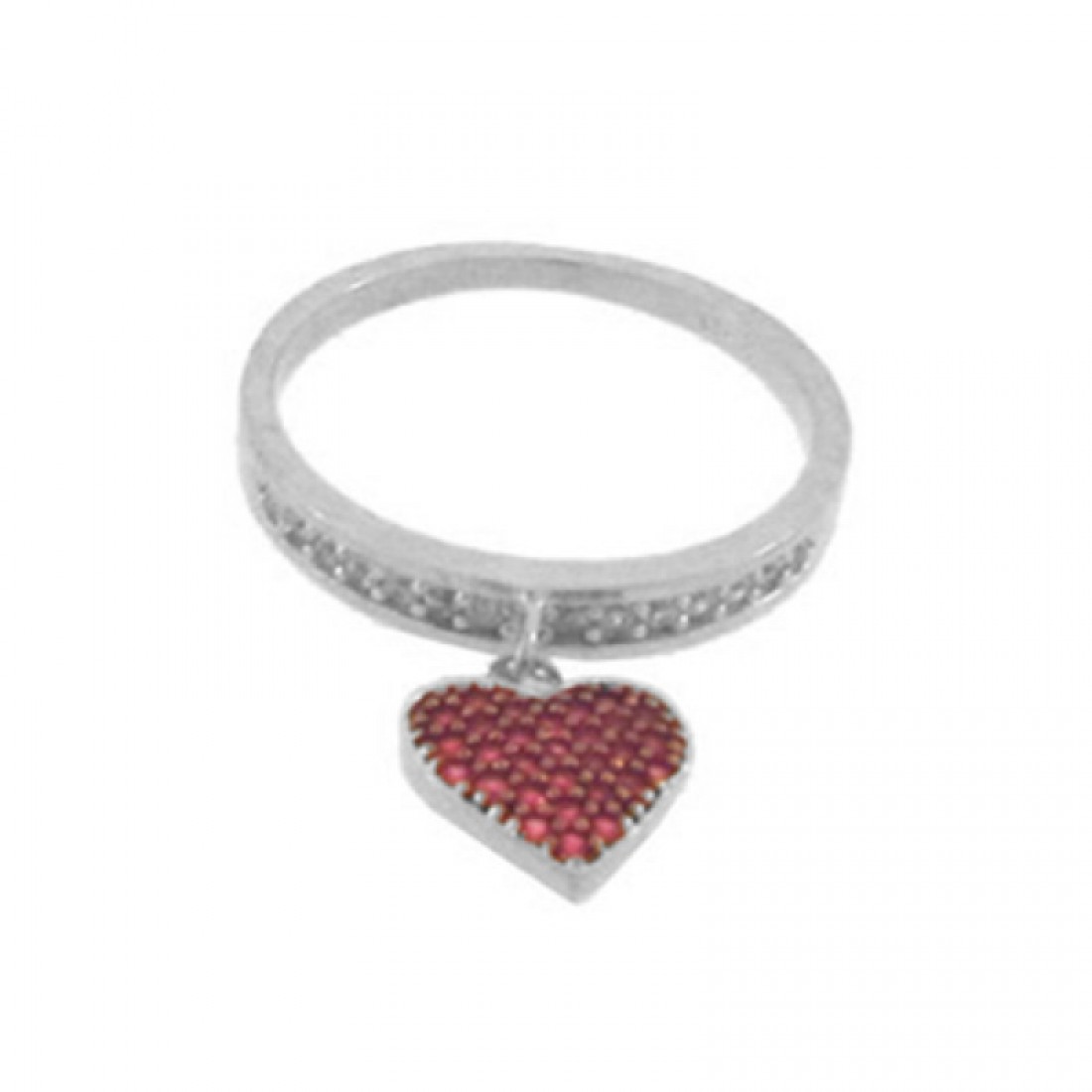 Anel aro zirconia cristal com coracao zirconia vermelha pendurada, prata com banho de ouro...