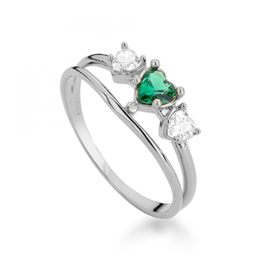 Anel aro liso com 3 coracoes zirconia verde no coração do meio, prata com banho de ouro. 1400478..