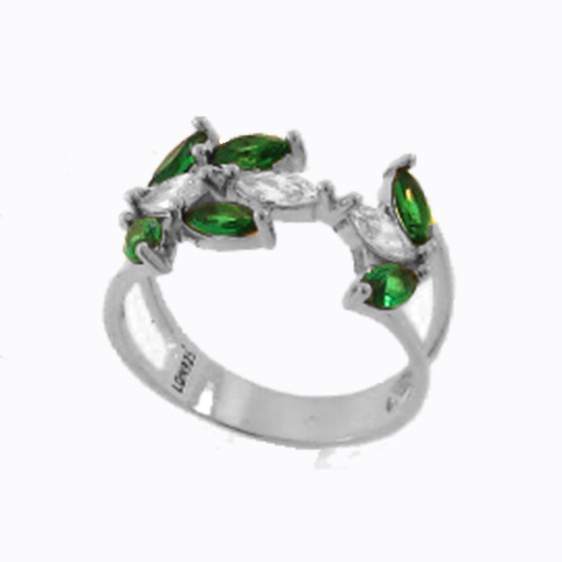 Anel 9 navetes, cristal no centro e verde nas latearis, prata com banho de ouro...