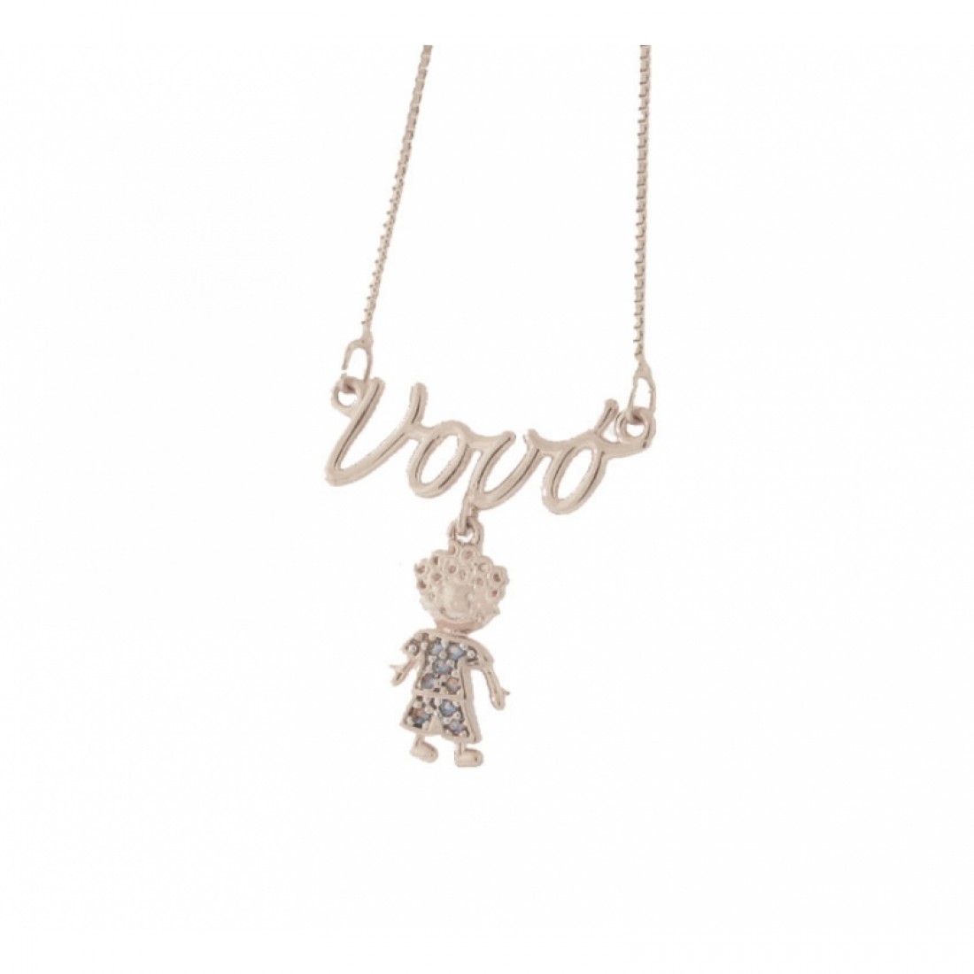 Colar vovo com menino pendurado zirconia azul claro, prata com banho de ouro...