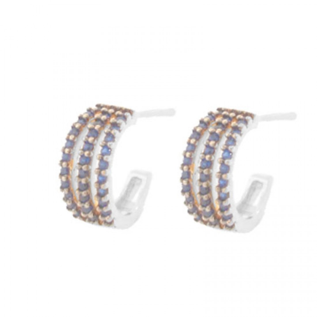 Brinco meia argola media 3 fios zirconia azul safira, prata com banho de ouro. 151570..