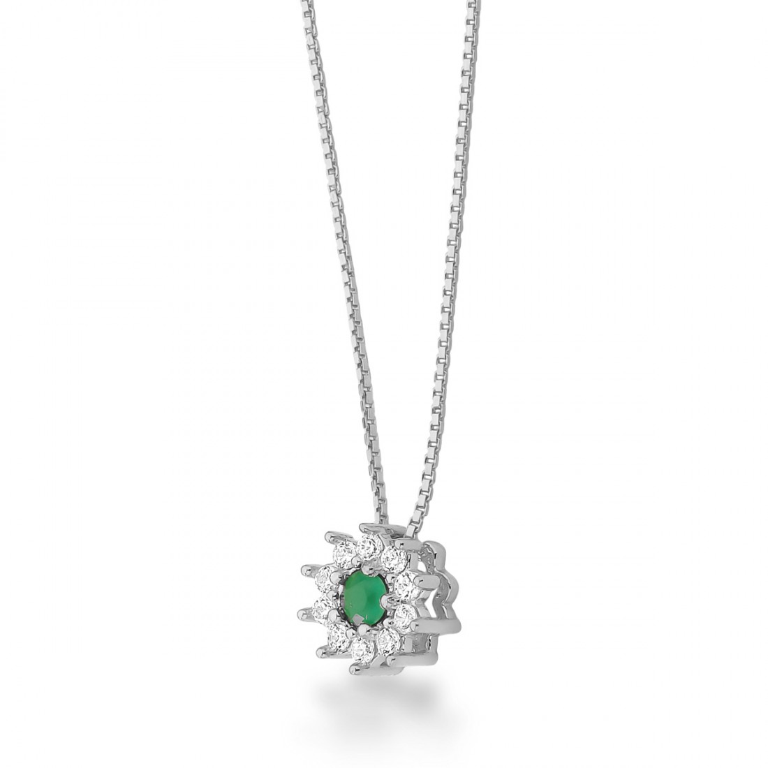 Colar flor pequena zirconia verde centro e cristal em volta, corrente 40cm, prata com banho de ouro. 1630238..