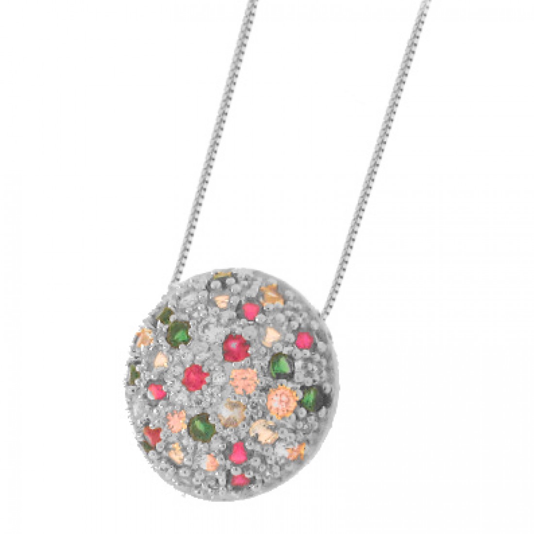Colar chuveiro redondo grande zirconia colorida, prata com banho de ouro...