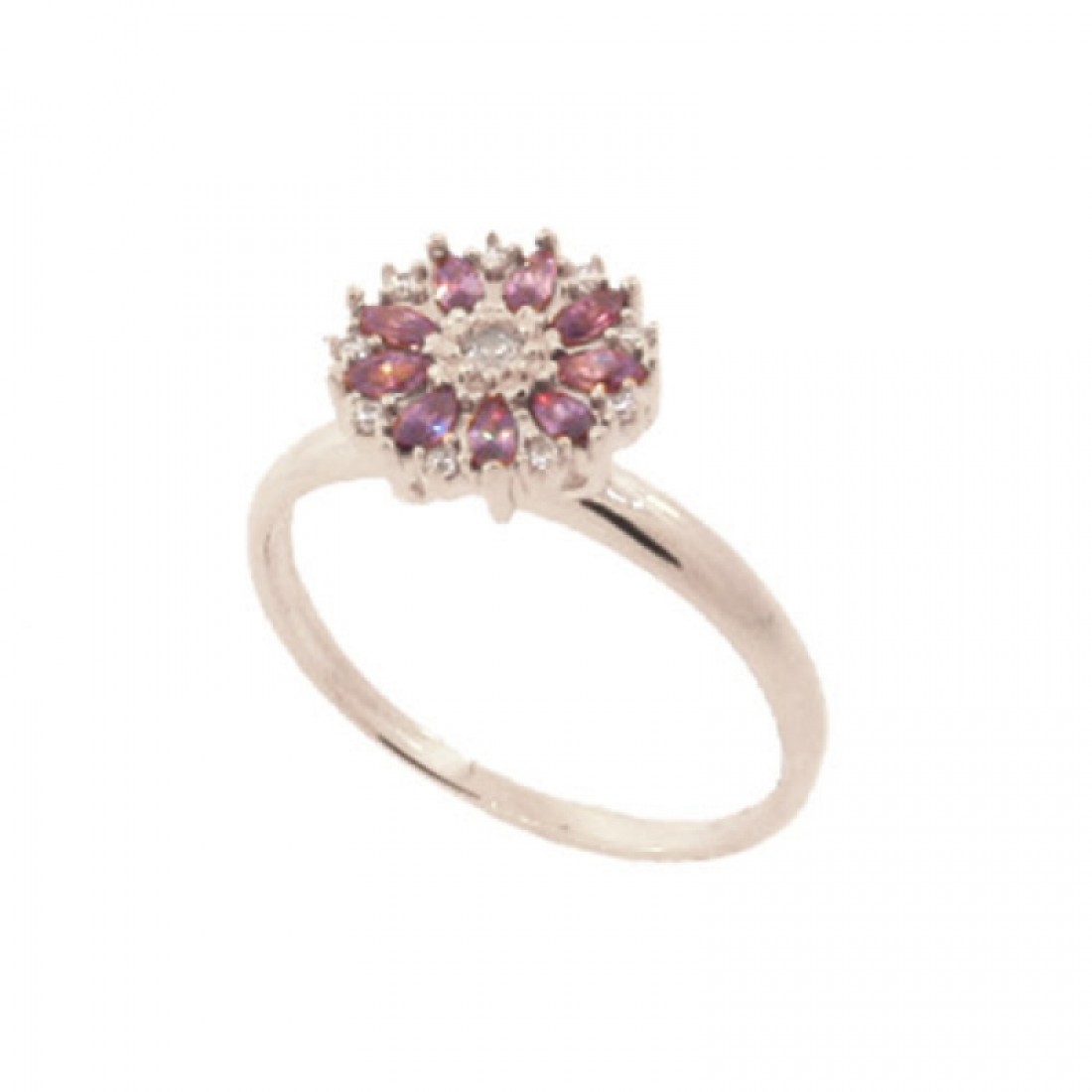 Anel flor navete lilas com miolo zirconia cristal, prata com banho de ouro...