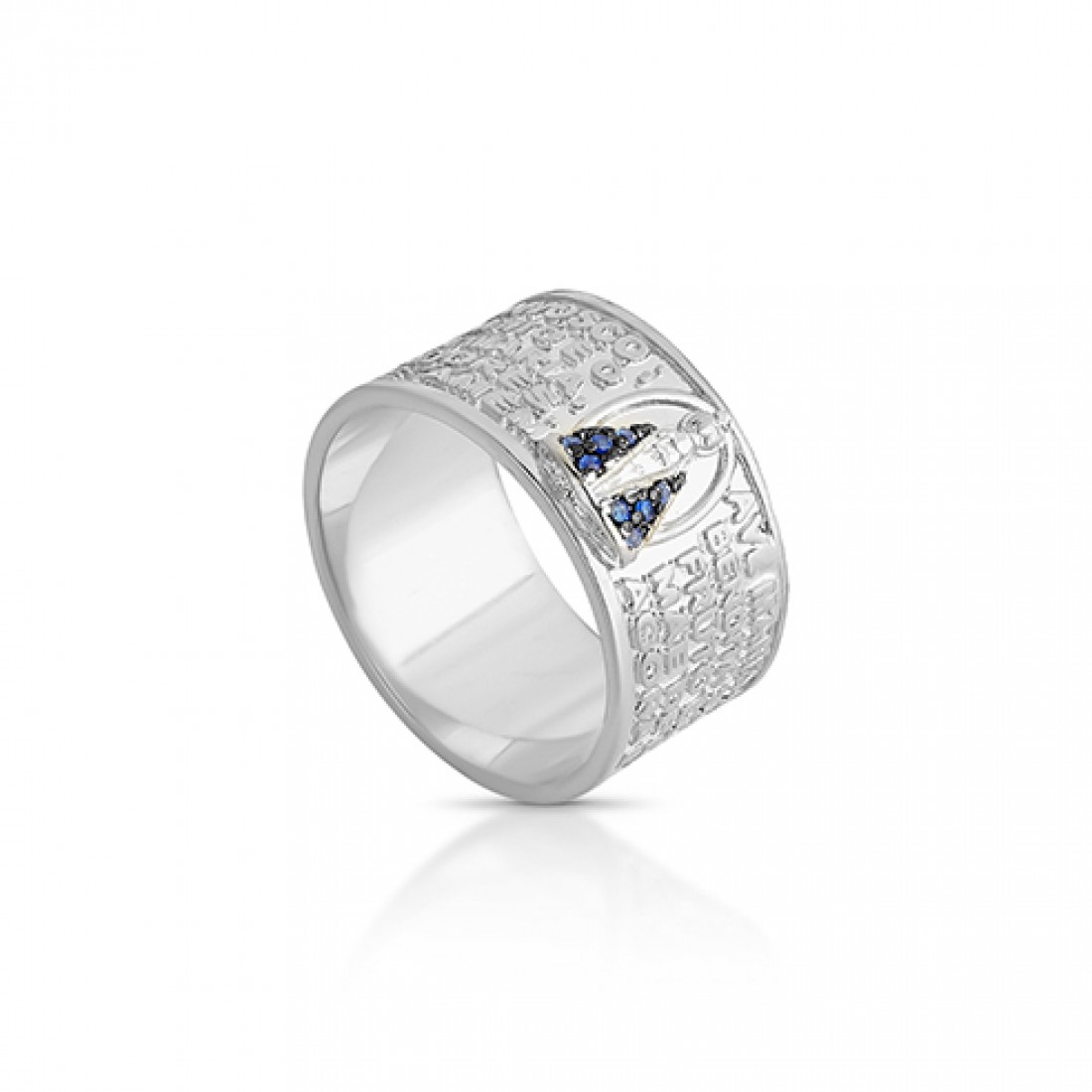 Anel 10mm manuscrito Ave Maria com Nossa Sra Aparecida em relevo com zirconia azul safira. 1415442..