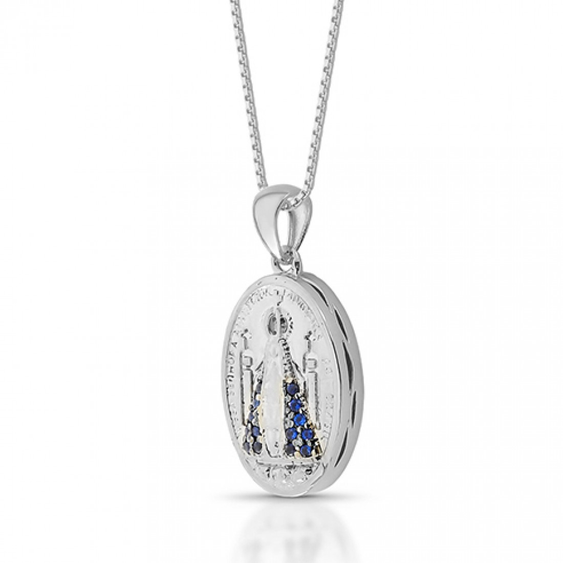 Colar medalha oval 2cm Nossa Senhora Aparecida manto azul safira, corrente 45cm. 3620692